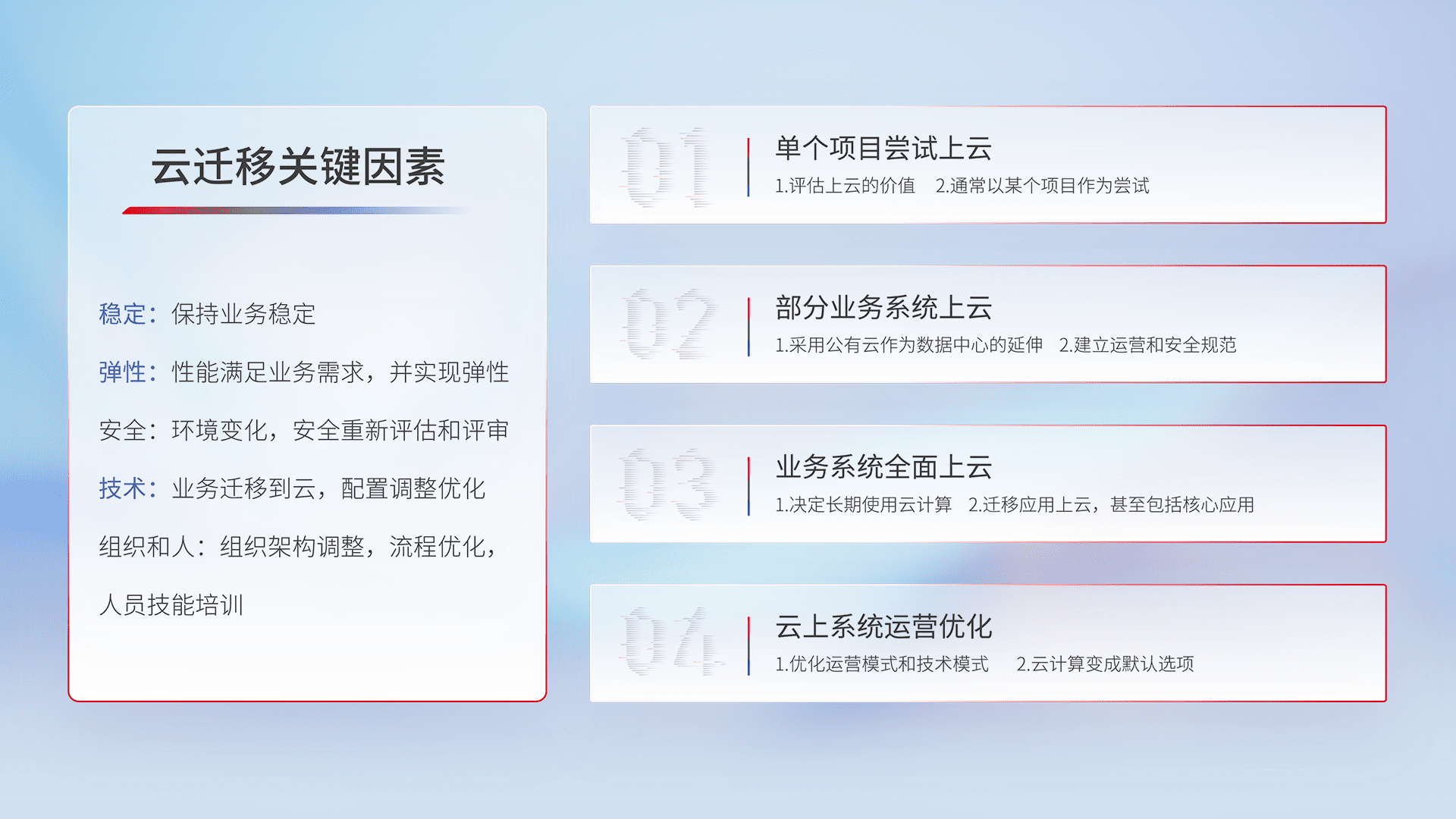 结合实际业务,,从规划设计、、、、云平台选型、、、、云原生改造、、、数据迁移、、集成交付,,迁移全过程为客户识别最佳上云路径,,做好风险识别管理,,设计网络架构、、身份权限、、、、安全审计合规、、操作审计、、日志审计、、、监控告警策略、、、多站点容灾设计等,,对云上基础设施进行整体规划,,,,提升IT治理水平,,,以满足弹性、、高可用、、、高性能的需求。。。